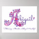 Hermoso cartel con monograma artístico perfecto para el dormitorio o la sala de juegos de una niña en tonos de blanco, rosa y morado. Personalice con el nombre de su hijo que comience con A, y el significado del nombre para un toque verdaderamente personalizado en el dormitorio o la guardería de su hijo, este ejemplo es para el nombre Abigail La alegría del padre. Altruista, inteligente y hermosa. Impresión de cartel lindo ideal para un regalo de bebé nuevo, bautizo o baby shower. © Diseño único de monograma de corazones y flores y diseño gráfico por Sarah Trett. www.sarahtrett.com para www.mylittleeden.com