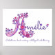 Hermoso cartel con monograma y nombre artístico perfecto para el dormitorio o sala de juegos de una niña en tonos de blanco, rosa y morado. Personaliza con el nombre de tu hijo que comience con A, y el significado del nombre para un toque verdaderamente personalizado en el dormitorio o guardería de tu hijo, este ejemplo es para el nombre Amélie Trabajadora, industriosa, inteligente y esforzada. Impresión de cartel lindo ideal para un regalo de bebé nuevo, bautizo o baby shower. © Monograma Único A con corazones y flores descripción del dibujo y diseño gráfico por Sarah Trett. www.sarahtrett.com para www.mylittleeden.com