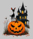Pasemos a las vibraciones de Halloween de los años 70 con este ilustracion de inspiración vintage. En el centro, una clásica linterna de calabaza tallada luce una sonrisa espeluznante, mientras que un ciervo delicado se perfila encima de ella. En el fondo, se alza una gran casa embrujada, que completa el ambiente espeluznante. Perfecto para los amantes de la estética retro de Halloween, este diseño le da vida al encanto de antaño. Ideal para vestimenta, decoración casera y más.