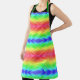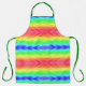 Un delantal vibrante presenta un gradiente de arcoíris con ondas geométricas, mostrado de frente y llevado por una persona sonriente con una camisa azul claro.