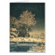 Un Día de Invierno en el río Sumida en Japón, por Tsuchiya Koitsu — El fresco aire de invierno colgaba sobre las orillas del río Sumida. La nieve, una manta de blanco prístino, silenció los sonidos de la bulliciosa ciudad. Una figura solitaria, una mujer con un kimono vibrante, su rostro oscurecido por un paraguas tradicional, se apresuró a recorrer un camino con polvo de nieve. Su destino: una pintoresca casa de madera enclavada en medio de la tranquilidad de los bosques de Suijin. — Esta escena, obra maestra del reconocido artista Tsuchiya Koitsu, captura la esencia de una era pasada en un Japón que cambia rápidamente. Un poderoso árbol, con sus ramas llenas de nieve, se encuentra centinela en el centro, su reflejo brilla sobre las aguas quietas de un estanque cercano. El río Sumida, testigo silencioso del paso del tiempo, serpentea su camino a través de la imagen. — En la orilla izquierda del río Sumida, cerca del bosque de Suijin, reina la tranquilidad. La presencia de la mujer, su colorido kimono, contrasta marcadamente con los tonos apagados del invierno, insinúa una vida llena de tradición. El curado de humo de la chimenea de la antigua casa, parcialmente oscurecido por los árboles, habla de calor y de una forma de vida más sencilla. — Al otro lado del río, a la derecha, se desarrolla una historia diferente. Los edificios, crudos e industriales, atraviesan el horizonte a lo lejos. Las nubes de humo de sus chimeneas, un testimonio de la marcha implacable del progreso. Aquí, el artista pinta una imagen de un nuevo Japón, impulsado por las ruedas de la industria. — El árbol central sirve como una poderosa metáfora, sus ramos llenos de nieve que dividen lo viejo de lo nuevo. Sin embargo, la escena no es una escena de dura división. La mujer, atrapada entre los dos mundos, encarna la esperanza de una coexistencia armoniosa. Tal vez representa un puente entre el pasado y el futuro, un testimonio del espíritu perdurable de tradición incluso frente al cambio. — El uso magistral del color por parte de Tsuchiya Koitsu refuerza la narrativa. El azul del agua evoca una sensación de serenidad, mientras que los grises y blancos de la nieve y el cielo crean un ambiente de invierno tranquilo. El vibrante kimono de la mujer, un toque de color contra el silencioso telón de fondo, subraya el poder duradero de la tradición. — "Un Día de Invierno en el Río Sumida en Japón" es más que solamente un paisaje; es una emotiva reflexión sobre una nación en flujo. Es un recordatorio de la belleza del pasado, la marcha implacable del progreso, y la esperanza perdurable para un futuro que abarque a ambos. — Esta obra de arte de 1949 de Tsuchiya Koitsu (1870-1949) es de dominio público en su país de origen y en otros países y áreas donde el plazo de derechos de autor es la vida del autor más 70 años o menos.