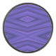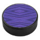 Un disco de hockey con un patrón geométrico púrpura vibrante que muestra formas de diamante en capas. La vista lateral muestra un borde negro texturizado. El tono es moderno y audaz.