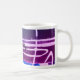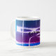 Una tira de impresión abstracta linda, con colores azules y morados, sobre una taza blanca clásica, con texto que dice "SERENE~CALM~PEACE"