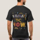Diseño de una camiseta con el texto "Navegar por ahora" en letras geométricas y en negrita, colocado sobre un fondo de líneas y formas coloridas.