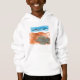 Una divertida y colorida pluma acuática y un dibujo en tinta de una tortuga marina en la playa (¡y no te pierdas el cachorro en el surf!) adornan la parte delantera de esta cómoda capucha de niño.