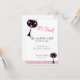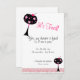 Graciosa invitación para un fiesta "el divorcio es definitivo". Dos vasos negros de bebida con flores rosas y una cereza - uno pequeño en el fondo y uno grande en la parte superior. Tira de encaje rosado en la parte inferior. El texto se puede personalizar para que la invitación sea totalmente tuya.
