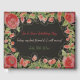 Un bonito libro de huéspedes floridos de negro con un diseño de arte floral de estilo victoriano. El texto de la parte delantera puede personalizarse en cualquier mensaje, o el texto puede eliminarse. El fondo negro se puede cambiar a cualquier color para coordiante con el tema boda.