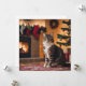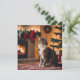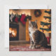 Una tarjeta de Navidades personalizada con una habitación decorada que incluye un bonito gatito, un árbol de Navidad, una chimenea y medias colgadas del manto.