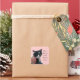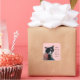 Foto de un lindo gato de esmoquin blanco y negro con un vestido de rayas rosas y blancas, con un hueso verde encima, con el mensaje: Cuando pienso en ti, pienso en la paz, está impreso en pegatinas. El mensaje se puede personalizar en el formulario de plantilla.