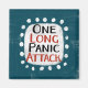 Un diseño tipográfico lindo que dice "Un largo ataque de pánico". Es texto en negro y rojo sobre un rectángulo blanco con puntos blancos divertidos y juguetones rodeándolo, todo sobre un fondo verde azulado.