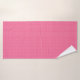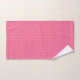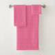Un juego de ropa de baño con estampado de gingham rosa cuelga de una barra de plata; incluye una toalla, toalla de mano y paño facial, exudando un tono fresco y vibrante.