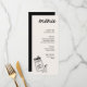 Estos elegantes menús para la cena en blanco y negro incluyen la opción de personalizar total de todos los títulos y textos. La parte frontal incluye texto negro con un gráfico en blanco y negro que coincide con el gráfico. La parte posterior es negra y sólida con sus iniciales. Introduzca la Herramienta de diseño de Zazzle para personalizaciones de diseño adicionales.