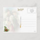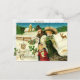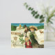 La vintage postal navideña que muestra a una familia victoriana (padre, madre y su niñita), todas envueltas en su finería, llevando regalos envueltos, estribos de holly, y una rama de pino con conos de pino. La esposa está vestida con un lujoso abrigo de piel verde y un gorra de plumas. Están paseando por la nieve, y al fondo se puede ver un reno, una cerca de piquetes y posiblemente una iglesia. Imágenes de HTM