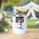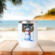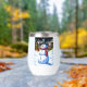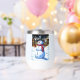 Un animado muñeco de nieve con sombrero de punta y bufanda roja se para en primer plano en la escena de un pueblo nevado. Las luces de las casas enrolladas iluminan el cielo nocturno, creando un ambiente festivo y acogedor. Photoshop CS5 de arte digital