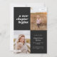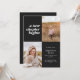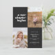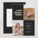 Esta moderna invitación de graduación incluye las palabras "comienza un nuevo capítulo" en la parte superior izquierda de la tarjeta sobre un fondo negro. Tiene espacios para dos fotos verticales para celebrar el viaje de tu graduado hasta ahora, una foto del pasado y una del presente. La parte delantera de la tarjeta tiene espacio para el nombre del graduado, el año de clase, la escuela y los planes futuros. La parte posterior de la tarjeta tiene espacio para texto adicional y se puede usar como invitación de fiesta de graduación o para escribir un mensaje personal.