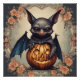 Un Cute Bat de Halloween con ojos expresivos se retrata en un fondo suave y borroso con una calabaza y flores. Los colores naturales realzan el aspecto mural.