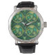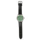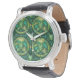 Un reloj de pulsera elegante con esfera redonda con un diseño de hojas tropicales vibrantes verde y amarillo. Tiene una caja de plata y una correa de cuero negro.