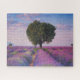 Esta es una hermosa imagen de un rompecabezas ya completado de un hermoso árbol y filas de lavanda. Las piezas del rompecabezas no coinciden con la imagen, lo que hace de esto un rompecabezas difícil de completar.