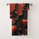 Un toque gótico, corazones y conexión eterna. El diseño presenta un diseño de fondo oscuro y elegante que llama inmediatamente la atención. Varios corazones rojos brillantes, algunos aparentemente convertidos en lágrimas, cuelgan de delicadas y delgadas cuerdas, dando a la carta un toque juguetón y romántico. El centro está dominado por un marco de diseño artístico con un interior rojo, decorado con un delicado patrón rosa que simboliza el amor y la pasión. En la parte inferior, la carta está decorada con exuberantes ramos de rosas rojas y plantas exuberantes, lo que pone de relieve el ambiente romántico.
