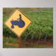Un tractor amarillo cruzando la señal en el viñedo