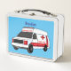 ¡Esta feliz ambulancia roja está en camino de ayudar! Dibujado en un divertido estilo personalizado.
