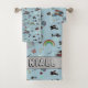 En este divertido juego de toallas están coloridos ilustraciones de modelos de aviación con helicópteros, globos de aire caliente, aviones en un escenario azul de ensueño con nubes, pájaros y arcos. Se puede personalizar en la toalla grande de abajo en una pancarta de plata con un nombre. Perfecto para cualquier niño que ame el mundo de la aviación.