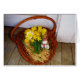 Una cesta de folletos amarillos y huevos de Pascua floridos, sentada en un porche al lado de una puerta blanca de época. Afeites amarillos, primavera, Pascua, AMARILLO, huevos, flores, flores, huevos, lavanda, antigüedades, cosecha, floral, rosa, burganeso
