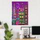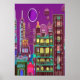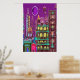 Una extraña ciudad colorida con mucho cielo púrpura, luna púrpura, rascacielos de aspecto extraño. Un arte único y extraño. Esta es una obra de arte generada por IA.