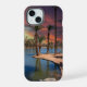 una espectacular puesta de sol en el parque Encanto con un lago rodeado de exuberantes palmeras verdes en Phoenix Arizona.