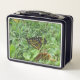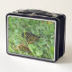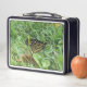 Una caja de almuerzo negra, color, Metalizado, con una foto, de una hermosa mariposa monarca, tendida en la hierba, en la parte delantera, y la misma imagen, en (reversa), en la parte posterior.