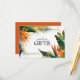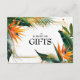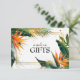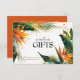 Presentamos la nota horizontal Aves of Paradise Bliss en la tarjeta de regalo, una elegante adición a tu papelería boda ambientada en el vibrante telón de fondo tropical de pájaros de flores del paraíso, hojas verdes y delicadas líneas rectas. La parte delantera de la tarjeta tiene un diseño limpio con la leyenda simple pero significativa "Una nota sobre los regalos". Esto establece un tono de buen gusto para el propósito de la tarjeta, permitiendo que la belleza visual de la colección ocupe el centro del escenario. Da la vuelta a la parte de atrás, donde un fondo naranja quemado en caliente sirve de lienzo para un mensaje atento a los clientes. Este espacio proporciona la plataforma perfecta para que la pareja transmita una nota personalizada, exprese su gratitud o proporcione detalles específicos sobre los regalos. En resumen, la nota horizontal sobre los pájaros del paraíso en la tarjeta de regalo muestra un equilibrio perfecto con su frente sobrio y elegante y un mensaje personalizado y cálido en la parte posterior. El diseño cohesivo y los detalles cuidados lo convierten en una adición práctica y elegante a su papelería boda, asegurando una presentación memorable y sincera para sus huéspedes.