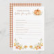 Celebre a su bebé que pronto llegará con sus amigos y familiares para compartir la alegría de la llegada de su pequeño con esta tarjeta de deseos para el bebé de la ducha de bebé que presenta una calabaza de acuarela, follaje de otoño y un patrón de cuadros marrón naranja en la parte posterior.