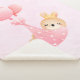 Una manta con un ilustracion adorable. Un pequeño conejito de bebés con una pequeña corona dorada. Llevado por globos en una manta rosa de corazón.