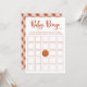 Tarjeta de bingo para ducha de bebé de la colección de Baby Shower A Little Cutie Pie Fall, que incluye "Baby Bingo" en un guión caprichoso de terracota con las instrucciones del juego que se imprimen a continuación. La disposición de las tarjetas incluye espacios para los clientes, con un ilustracion acuarela de calabaza como espacio libre en el centro. La parte trasera muestra un patrón de gingham que se coordina en cálidos tonos otoñales, lo que la convierte en una elección festiva y rústica para una ducha de bebé con tema de caída o calabaza. Un juego divertido e interactivo que mantiene entretenidos a los huéspedes mientras celebran a la futura madre.