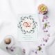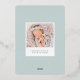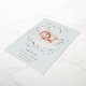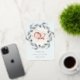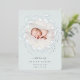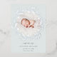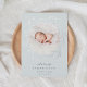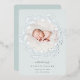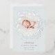 Elegante anuncio de nacimiento en colores suaves presenta una foto redonda de recién nacidos rodeada por una corona de ramas y hojas botánicas de Relieve metalizado plateado, con "presentando [Nombre]" en la parte inferior con letras grises de moda. Personalice con la fecha de nacimiento del bebé, y las estadísticas de nacimiento debajo, y agregue un mensaje personal a la parte de atrás, junto con una foto adicional.