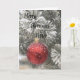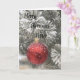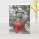 Una rama de árbol de Navidad con una burbuja roja cubierta de nieve