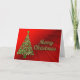 Una hermosa tarjeta de Navidades dorados y rojos. Un árbol verde abstracto coronado por una estrella brillante.