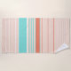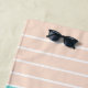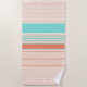 La toalla de playa es de color melocotón, sobre todo de rayas. Naranja blanco, verde-azul, quemado.