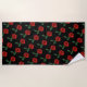 Esta bonita toalla de playa florida, decorativa, muestra un patrón repetido de una exquisita rosa roja escarlata con tres hojas verdes sobre un fondo negro.