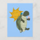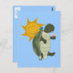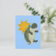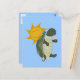 Una tortuga disfruta de un cono de helado en un día cálido en la imagen de los medios mixtos de esta postal. La tortuga verde se sienta erguida con las piernas estiradas. Sostiene un cono de gofre lleno de helado cubierto de rociadores de colores. La sonrisa en su rostro mientras lame la comida congelada muestra su satisfacción. Una mariposa azul se ha iluminado en su concha y un sol sonriente brilla sobre ambos. De mi imagen original creada digitalmente.