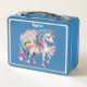 Un unicornio muy lindo con una cola y una cola de color arcoiris pintadas en sus zanjas hace una caja de almuerzo para una niñita. Perfecto para la escuela o el hogar.
