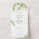 Nuevas invitaciones de boda multiplicidad en un formato de sellado y envío elegante. El diseño cuenta con plantas botánicas acuáticas de verano en diferentes tonalidades de verde y salvia. Los detalles se establecen en una tipografía de escritura a mano de moda en un azul polvoriento con un tipo de letra serif tradicional. Hojas de color verde agua ilustradas por Victoria Grigaliunas. Personalizar cada solapa con los datos de su boda y dirección de retorno. Perfecto para bodas tropicales en la playa o simple boda elegante y lujoso. Para ver más invitaciones de boda con rsvp y sobres de Victoria Grigaliunas de Do Tell A Belle visita www.zazzle.com/dotellabelle