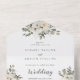 Esta florida invitación de invierno en una boda es perfecta para una elegante boda. El diseño es sencillo y cuenta con flores blancas con vegetación de invierno y hojas de eucalipto, con un ambiente campestre moderno. Escriba las direcciones de los invitados a mano en la parte posterior de la invitación doblada o utilice los pegatinas coordinadores de las etiquetas de direcciones de los invitados (se venden por separado).