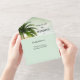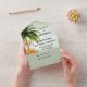 Todo ello en una sola invitación con un diseño de playa tropical en colores verde bonito y verde azulado. La parte RSVP de esta invitación tiene una plantilla de código QR a la que puede agregar fácilmente una dirección URL a su propio sitio web. Alternativamente, sus invitados pueden sacar esa parte de la invitación para completar su información y enviársela por correo. También puede utilizar este área para agregar información sobre alojamiento o direcciones si lo desea.