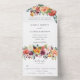 Esta invitación a la boda del otoño de bonito incluye flores de otoño y un diseño sencillo y todo en uno. La acuarela floral incluye melocotón, polvorientas rosas rojas, violetas y ricas rosas amarillas con un frondoso follaje verde. La invitación a la boda y el RSVP presentan una tipografía moderna y un diseño elegante. El RSVP incluye tres opciones de comida. Papelería boda coincidente con nuestra colección "Autumn Elegance".