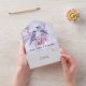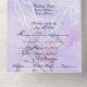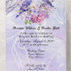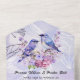 Hermoso tono de púrpura claro en una invitación con un par de pájaros azules entre lilas púrpuras y rosadas.