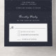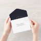 Esta moderna y elegante invitación a la boda se caracteriza por una serie de delicadas estrellas sobre un fondo azul oscuro.