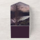 Esta suite boda romántica y monótona presenta una paleta de tonos malvas oscuros. Castillo de estilo gótico en la orilla del río rodeado de montañas y un solitario árbol de invierno. Los estilos de fuente clásicos complementan los tonos suaves de color para crear una sensación etérea oscura.