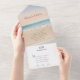 A tus invitados les encantará todo esto en una sola invitación a la boda. Un diseño de playa tranquilo es fácil de personalizar. Esto incluye su RSVP, que el invitado puede eliminar y enviarle por correo. Empieza ahora a personalizar este diseño de playa de arena costera. Una gran elección si su boda o recepción está en la playa o cerca de ella, como una boda de destino.