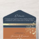 Captura la esencia del romance moderno con nuestra Invitación a la boda todo en uno de Terracota y Azul de la Marina. Este elegante diseño cuenta con encantadores pájaros enclavados en un falso encaje floral dorado, que le da un toque de brillo a su día especial. Personalízalo con una foto personalizado de la pareja en la parte de atrás, junto con detalles del boda e información de RSVP. Fije el tono para su celebración con esta sofisticada invitación que combina con gusto lo rústico y la moda con la elegancia atemporal. Por favor, tenga en cuenta que esta invitación "todo en uno" requiere un sobre separado para el envío de correo. Recomendamos emparejarlo con un sobre A9 estándar (5,75" x 8,75") para el mejor ajuste.